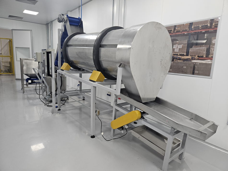 Falando um pouco mais sobre o temperador rotativo continuo, é importante mencionar que as principais partes que mantém contato com o alimento são feitas de aço inoxidável. E a máquina apresenta um sistema de aspersão de condimentos, que se utiliza do Bico Spray, bem como de um dosador de tempero sólido, para que os alimentos recebam a medida exata de tempero que precisam.